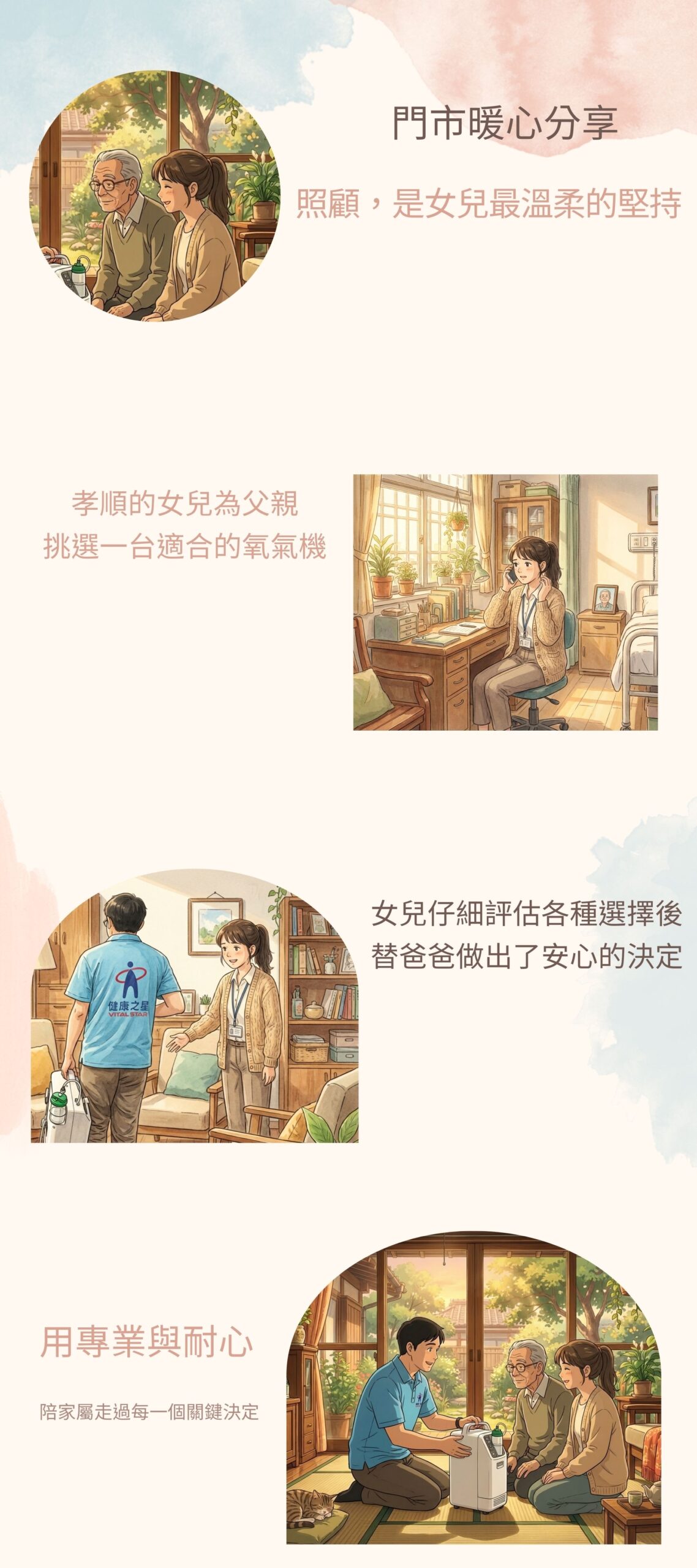 這次聯繫我們的小姐,因為爸爸需要使用氧氣機與抽痰機。當時爸爸仍在住院,家屬先行向我們預約。爸爸回家第一時間,我們將設備送達家中,向爸爸與看護說明機器的使用方式, 只希望家屬能照顧更安心。